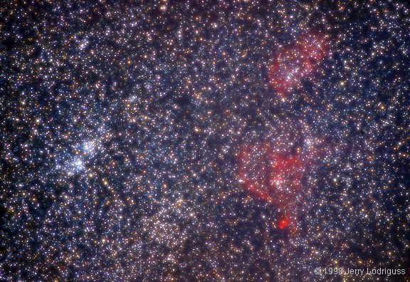 Перед вами двойное рассеянное скопление Хи и Аш Персея (слева), а также двойная туманность: IC 1848 (вверху) и IC 1805 (внизу).